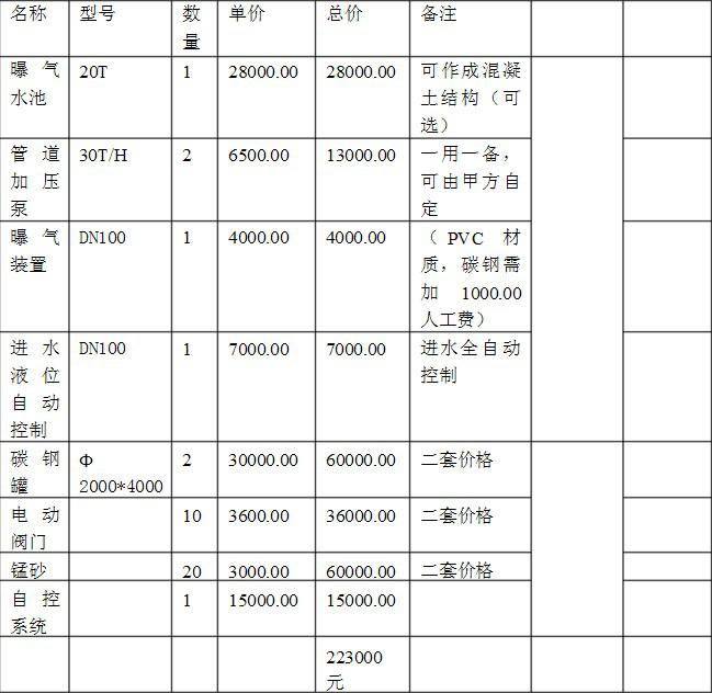 工藝過程中,曝氣裝置中的曝氣池可選用混凝土結構(由甲方制作),也可采用玻璃鋼結構。