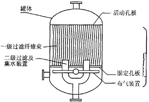 纖維束過濾器濾料采用長1m的纖維,捆扎成束, 固定在上濾盤。上濾盤起布水的作用。反洗開始 時,反洗水從上進水口進入濾罐,從下部流出;下 部升降電動機啟動通過螺旋帶動下托盤下行,松開 纖維束;上部電動機帶動上濾盤交替正反轉,濾料 在水中受到較大的水流沖刷。過濾時上部旋轉停 止,下部升降電動機帶動下托盤上行,壓緊纖維 束。濾液從下部進入,從上部流出。